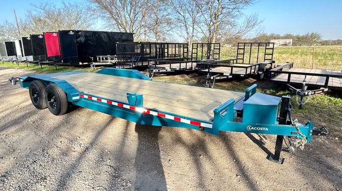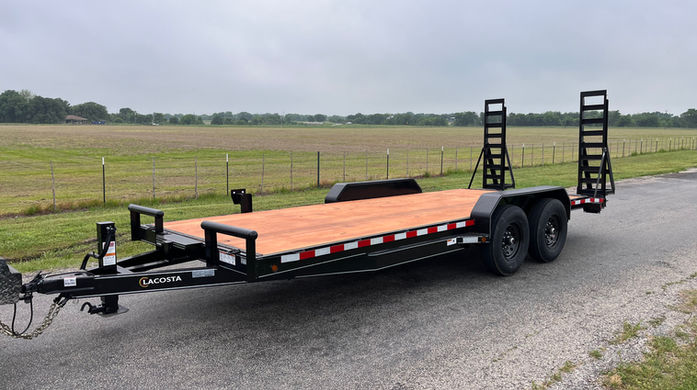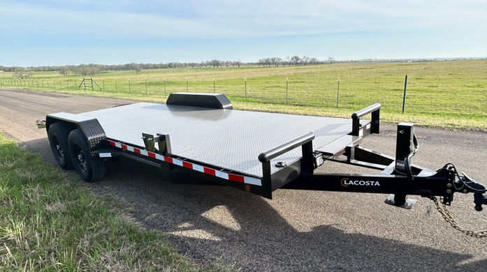 The 20x83 LaCosta heavy-duty car hauler is a Texas-built flatbed trailer made for reliable auto transport. Equipped with fold-up ramps and dual 7K axles, this rugged trailer is ideal for use as a car hauler, auto hauler, or general-purpose equipment trailer. Whether you're hauling vehicles or heavy loads, the LaCosta’s durable design and fold-up ramp system make loading and unloading fast and efficient.